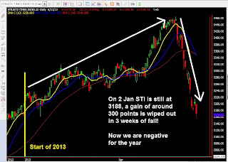 STI today breaks the price of 3188, the opening price of this year. And this happens in a matter of 3 short weeks of trading after a 4 months increase. Yes, everything is wiped out. We are at a deficit of 18 points now for the year. Given US and Japan strong showing for the year, STI really looks a great disappointment.